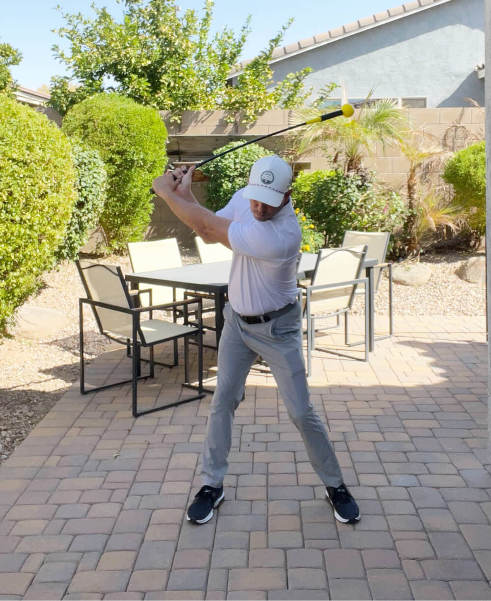 Use the speed and tempo trainer for 20 swings… and it becomes a gentle workout which tones the fundamental core golf muscles like your abs, obliques and lower back.